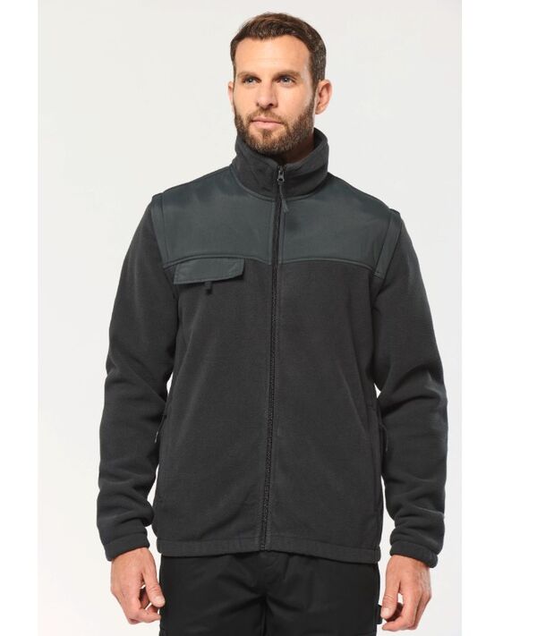 Veste polaire manches amovibles WK9105 - 2-en-1 renforcée Description produit La veste polaire WK9105 avec manches amovibles est un vêtement polyvalent qui se transforme facilement en bodywarmer selon les besoins. Conçue en polaire 100 % polyester 400 g/m², elle assure chaleur et confort. Les manches amovibles doublées en polyester 210T et les renforts Taslon enduits acrylique aux épaules et avant-bras offrent robustesse et durabilité. Ses 2 poches avant zippées et sa poche poitrine avec rabat auto-agrippant apportent praticité et sécurité. Caractéristiques techniques Matière principale : polaire 100 % polyester - 400 g/m² Manches : amovibles, doublées polyester 210T Renforts : Taslon avec enduction acrylique aux zones stratégiques Poches : 2 poches avant zippées + 1 poche poitrine avec rabat Finitions : poignets et ourlet élastiqués Produit 2 en 1 : utilisable en veste ou en bodywarmer Tailles : du S au 4XL Coloris : plusieurs (noir, gris, vert, navy...) Avantages professionnels Polyvalence : se transforme en gilet sans manches Durabilité : renforts Taslon aux zones exposées Confort thermique : polaire épaisse + manches doublées Pratique : multiples poches fonctionnelles Personnalisable : empiècements prévus pour marquage